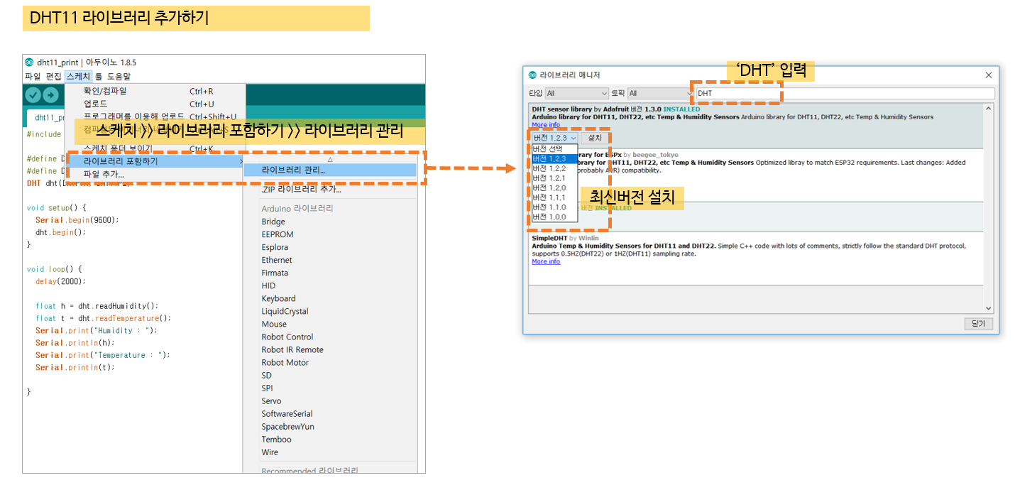 1) 우선 온습도 모듈 사용을 위해서는 아두이노 라이브러리를 설치 해주셔야 됩니다.