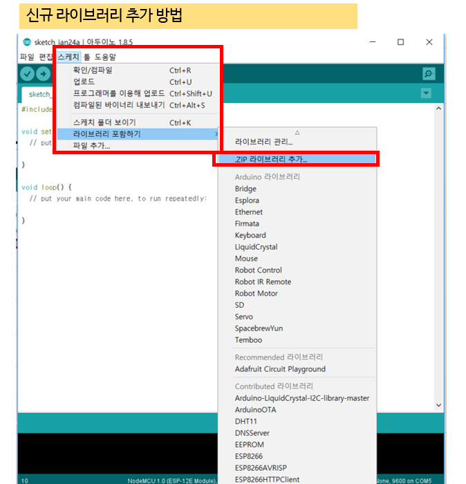 다운받은 라이브러리를 추가하기 위해서는 라이브러리포함하기에서 ZIP라이브러리 추가에서