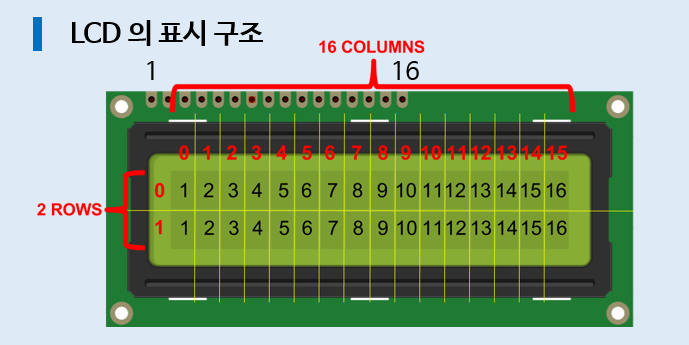 가로로 16, 세로로 2줄 총 32가지의 문자를 나타낼 수 있습니다.